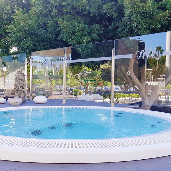 Para poder disfrutar del bienestar, también ponemos a su disposición una zona de jacuzzi rodeado de hamacas y vegetación.